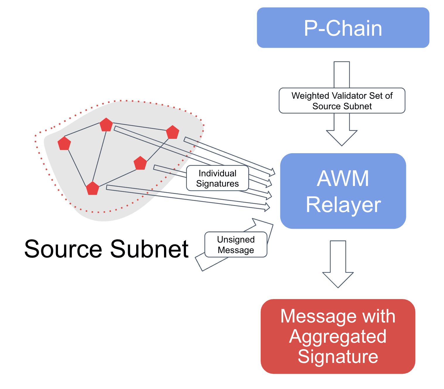 • Notification: The AWM Relayer is triggered whenever a new outgoing message is detected by a node.