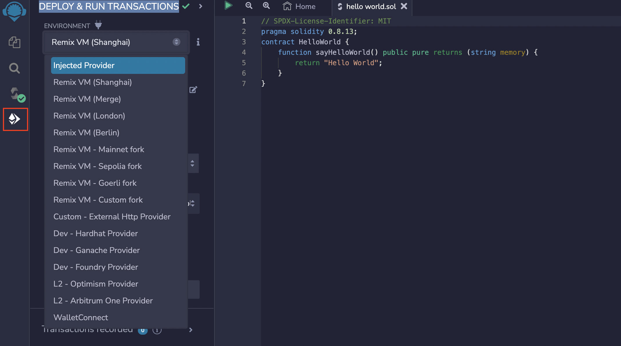 Now, the smart contract is compiled, Core is injected, and we are ready to deploy our Hello world contract. Click "Deploy."